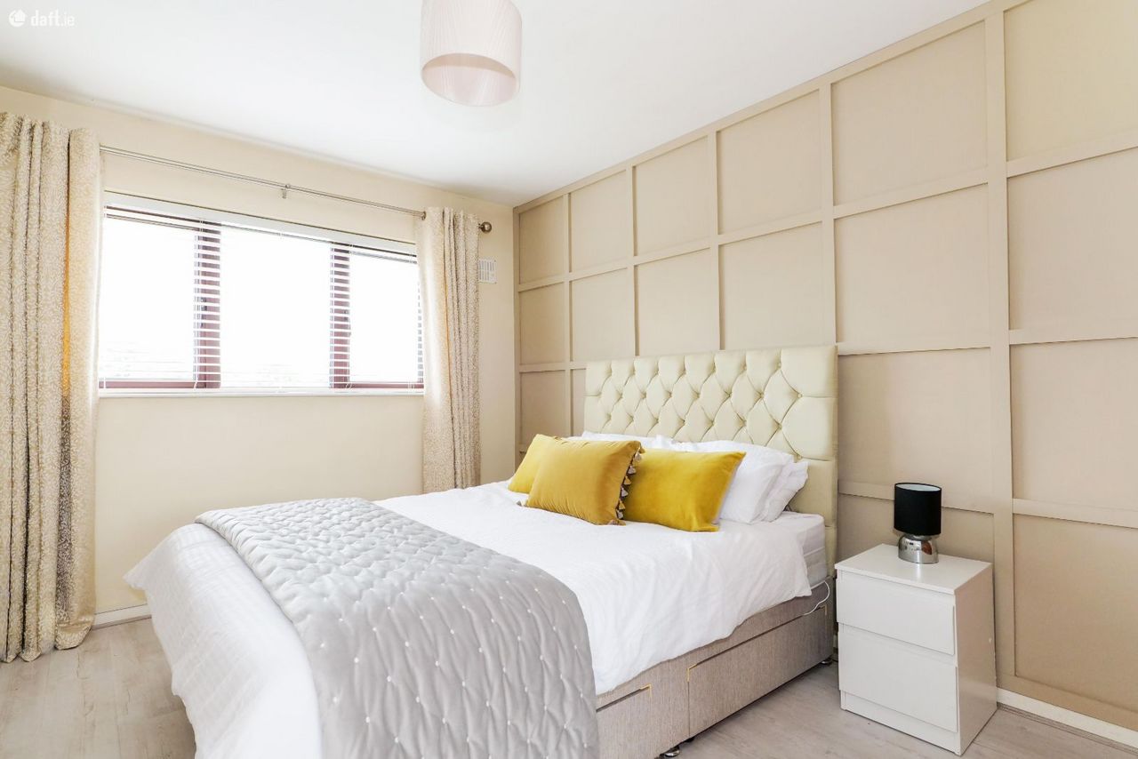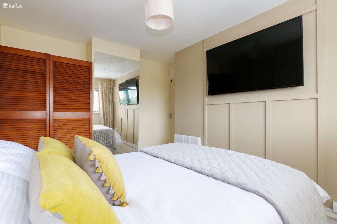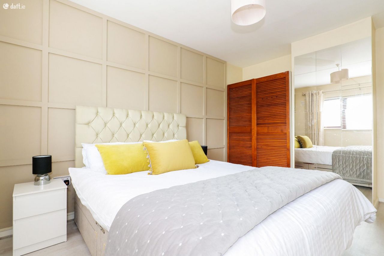 Next door is Bedroom 1, a double bedroom with a large window overlooking the back, wood flooring, a spacious hot-press/built-in wardrobe, and a built-in desk to the side. The Master Bedroom, or Bedroom 2, has a large window facing the front of the property, a floor-to-ceiling mirror wall, a built-in wardrobe, and a modern wood panelling feature wall behind the double bed.