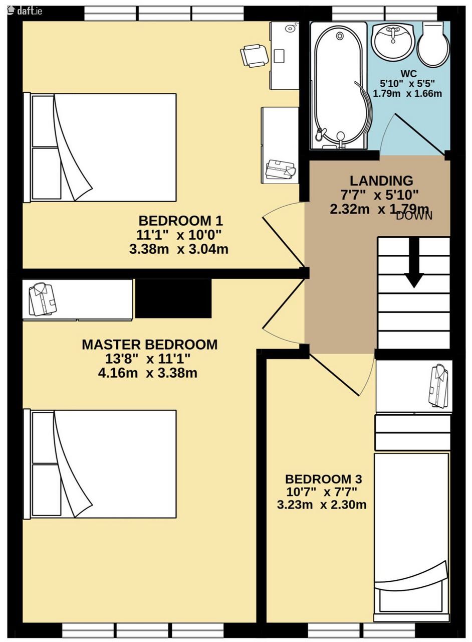 Bedroom 3 is a single room with a built-in wardrobe cleverly installed above the stairs to maximize space. Natural light pours in through the window overlooking the front. All rooms in this property are equipped with built-in storage heaters.