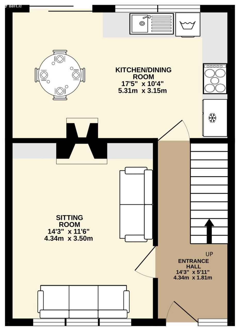 The kitchen is equipped with a hob and oven, extractor fan, washer/dryer, and a large fridge/freezer. To complement the bright cream cabinetsboth above and belowthe countertop and splashback tiles are a light-reflecting black, creating a sense of depth and space. The dining area includes a brick fireplace with a charming stove, a feature wall adorned with light green wallpaper, and a sliding door that opens to the back.